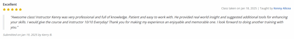 - Advanced Training Courses Completed: Intuitive Defense Shooting Instructor Development, Active Shooter Response, Armed Defense Around Vehicle, and Two-Person Armed Defense (Personal Defense Network – I.C.E.)